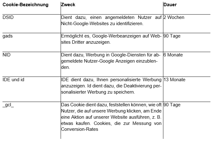 Weitere Informationen zur den von Google zu Werbezwecken verarbeiteten Daten finden Sie hier: https://policies.google.com/technologies/cookies?hl=de